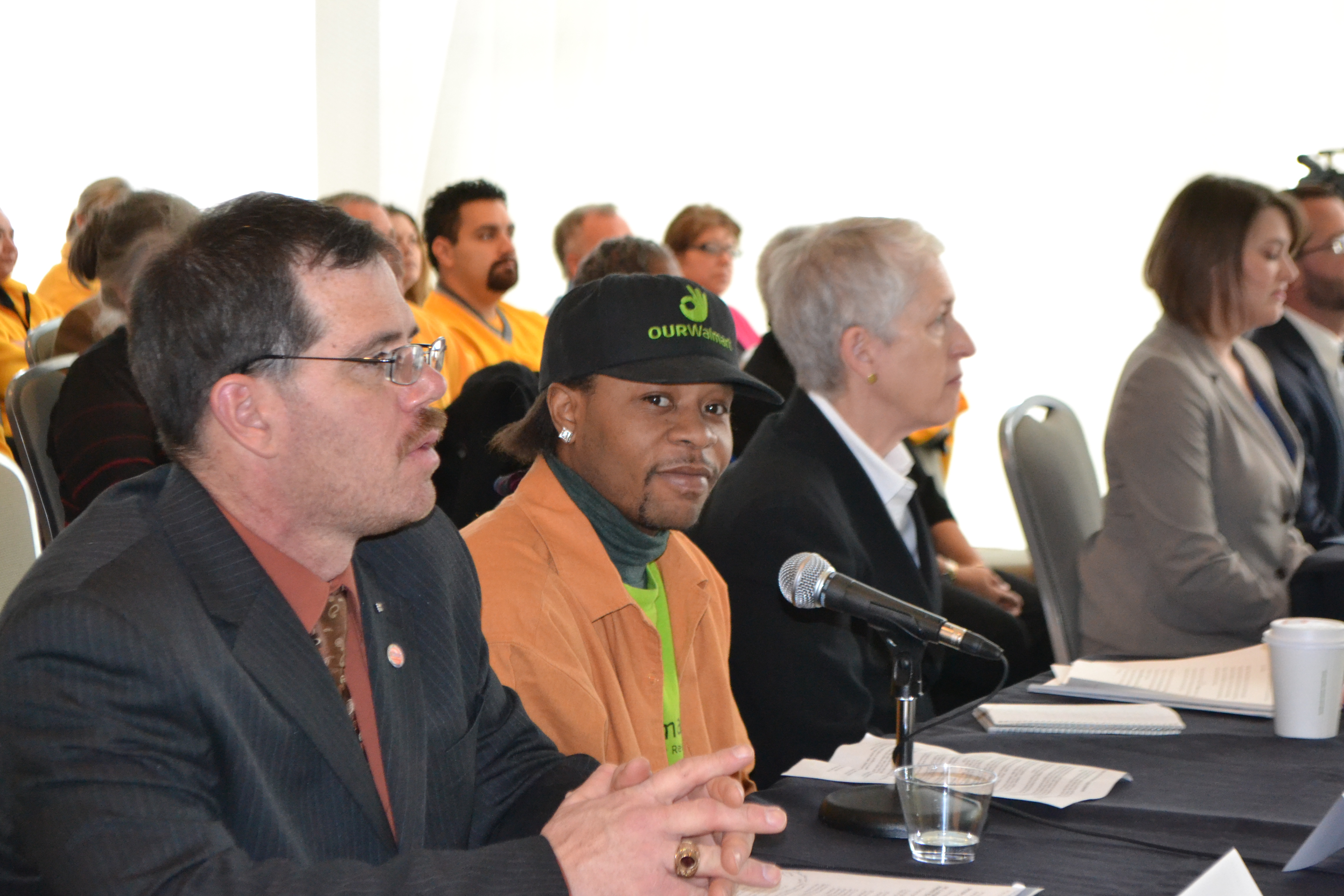 Jim Hutton (left), a Macy’s worker, and Tyrone Robinson (right), a Walmart worker, spoke about their struggle to survive as part-time workers in the Chicago area.