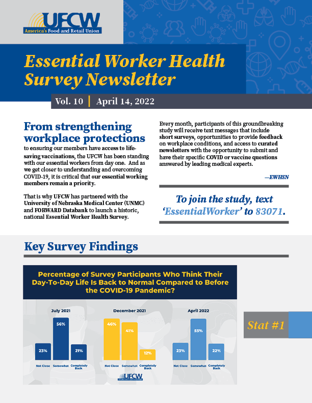 From June 2021 to May 2022, the United Food and Commercial Workers (UFCW) International Union partnered with researchers at the University of Nebraska Medical Center (UNMC) to conduct the largest longitudinal survey of union members who are essential workers during the COVID-19 pandemic.