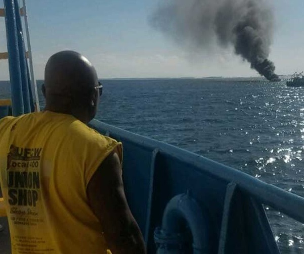 “The boat was going up in smoke and we could see six people in the water,” Taylor said. “They were wearing beach life jackets, not the kind we have. We got as close as possible and pulled them up onto the boat. They were really shook up. We were just blessed to have come along in time. They were one and a half miles offshore and there are a lot of sharks all over the coast now.”