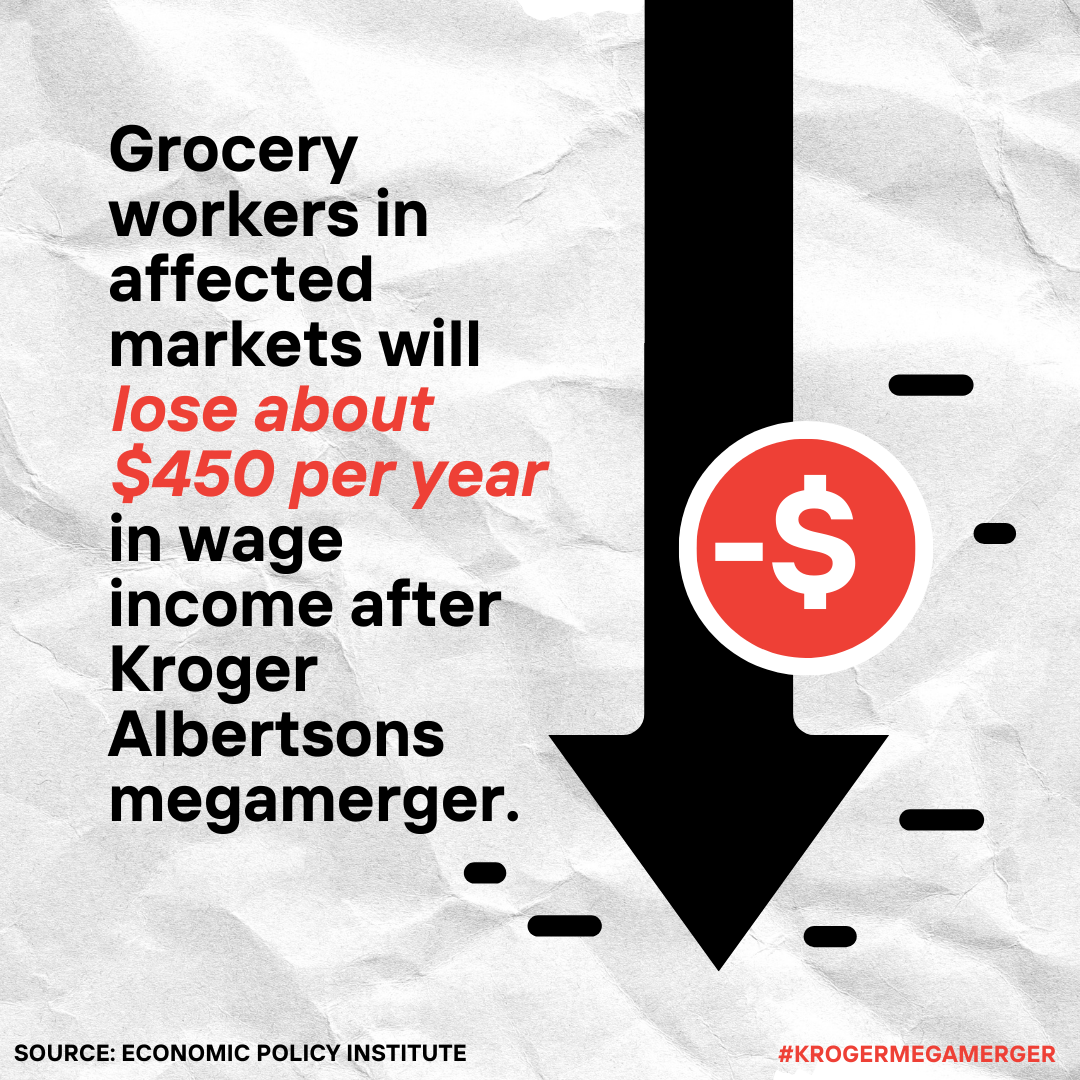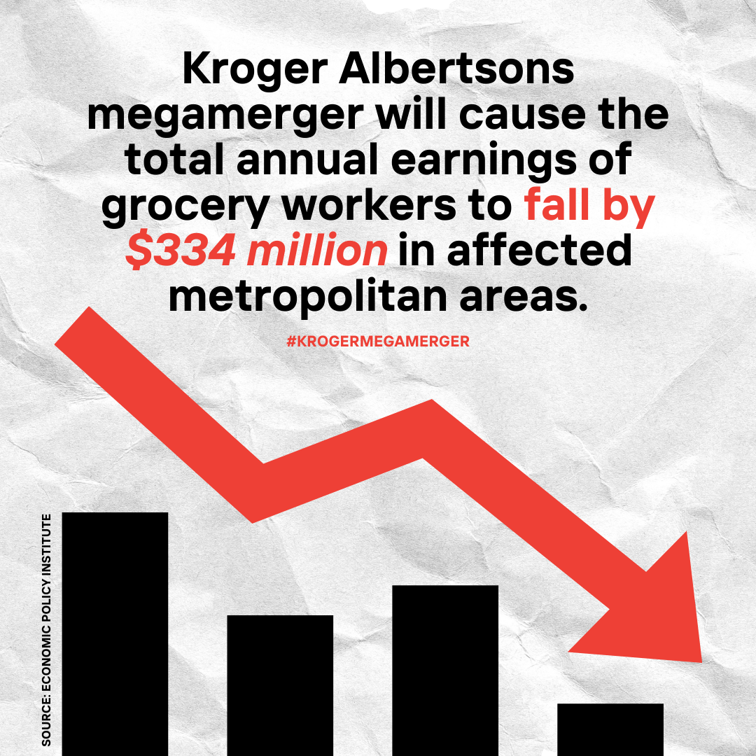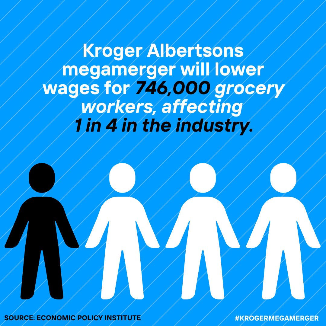 Independent organizations like the Economic Policy Institute (EPI) have been doing their own research, too. They found that this merger would lower wages – potentially over $300 million dollars annually or approximately $450 per worker – for 746,000 grocery store workers in over 50 metropolitan areas across the U.S., not just those who work at Kroger or Albertsons, but all grocery workers in these affected areas.