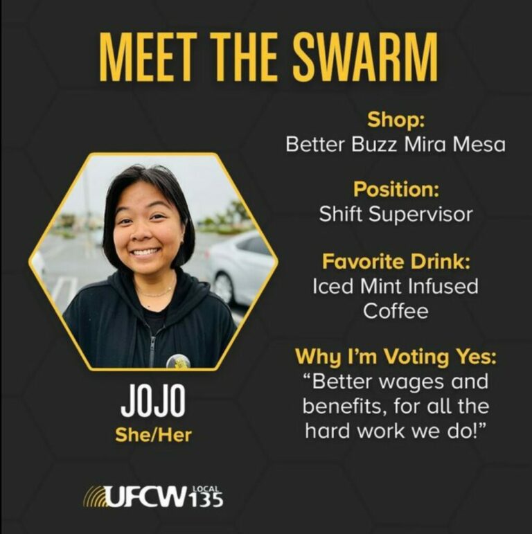“Winning the election to join UFCW Local 135 feels amazing! I’m super excited to see changes at the store, to see working conditions elevated, and I’m even more excited to see everyone happier at work,” said JoJo Concepción, who is a shift supervisor at the Better Buzz Coffee shop in Mira Mesa. “It’s empowering to know that together we can make positive changes to our work lives. I’m excited for what the future holds for us at Better Buzz Mira Mesa.”