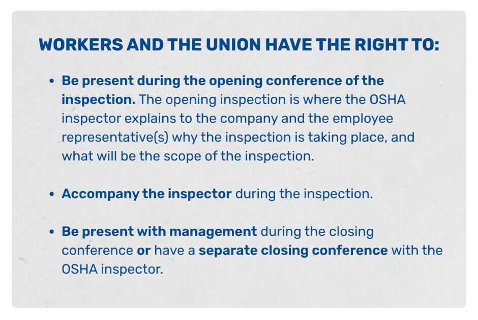 The union should receive copies of OSHA citations, if any are issued. During the closing conference, ensure that the OSHA inspector remembers to provide the union with a copy of the citations, which are also required to be posted at the work site for all employees to see.