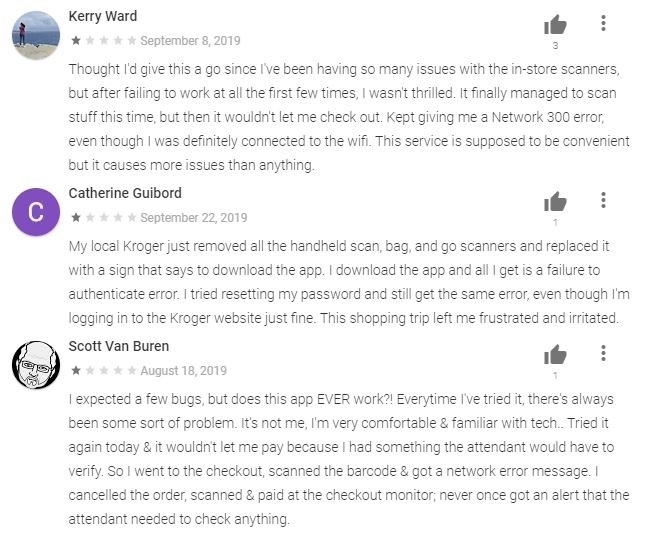 Customer sentiment towards scan and go shopping is pretty clear in the Scan, Bag, Go app, which has a 1.9 star rating in the Google Play store. Reading the reviews paints a clear picture of why “diffusing anger” would be a skill needed to help transitioning customers.