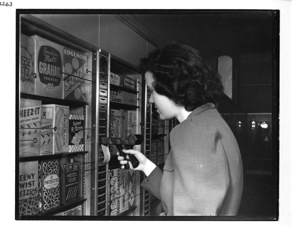Items were kept in separate glass cases so as to be easily seen and never handled. Entering customers received an aluminum “key” with a roll of ticker tape attached. They shopped the product windows as they pleased, slipping their key into slots in the displays and pressing buttons that punched Morse code-like data about their desired products. At the checkout, a shopper handed her key to the clerk, who simultaneously rung up the receipt and transmitted the key’s record to a backroom. There, workers bundled orders and sent them out to customers via conveyer belt. ‘It can’t miss. It’s the biggest thing I’ve ever had,’ Saunders told Time magazine. –Americans Have Been Cursing at Automated Checkouts Since 1937